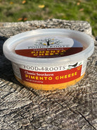 Food with Roots Pimento Cheese is rich, decadent, tangy from the sharp cheddar, sweet from the pickled sweet peppers, with a savory finish, and spreadable when warm.