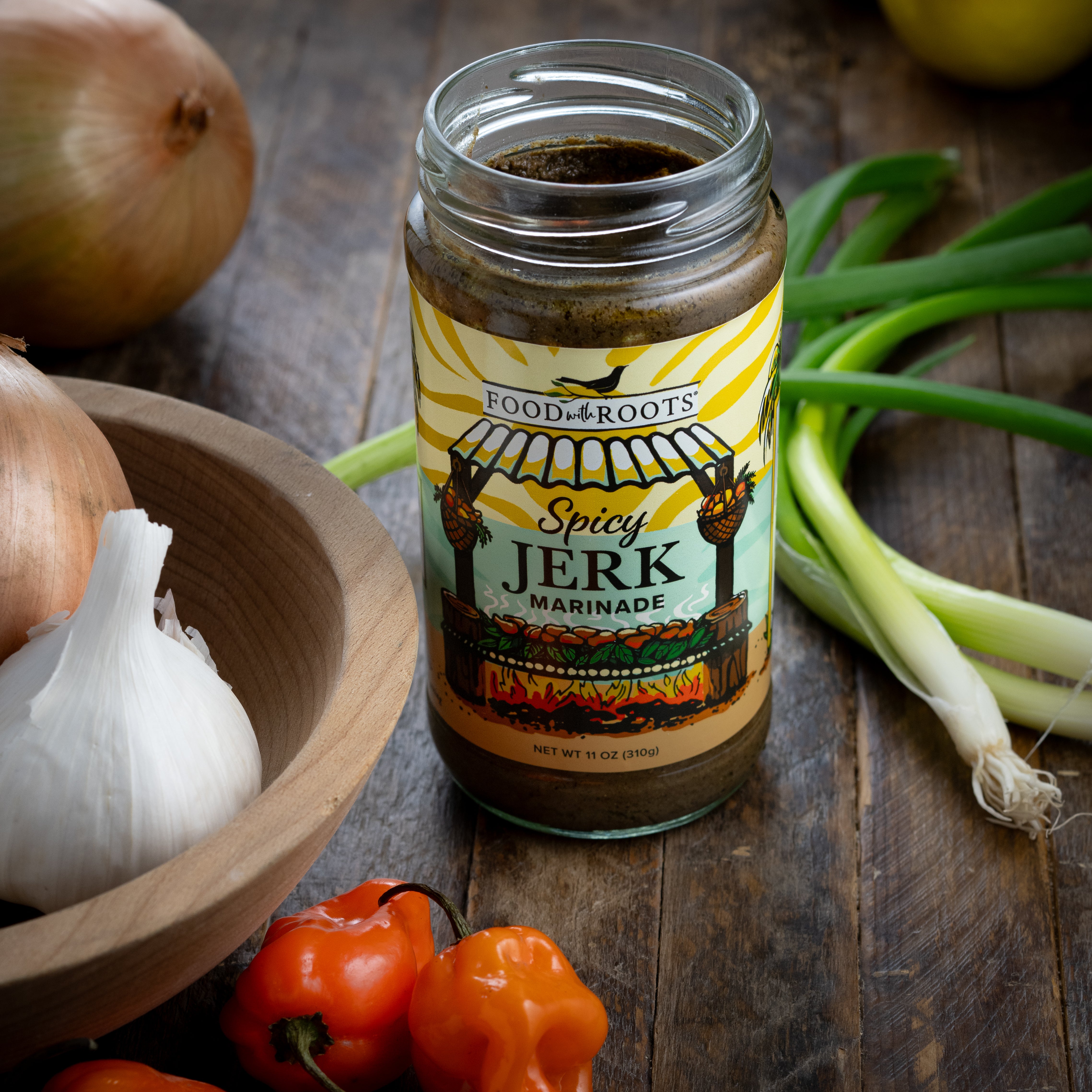Food with Roots’ authentic Jerk Marinade is a tribute to a centuries-old traditions and the soulful essence of island cuisine. We crafted our Jerk Marinade with a blend of exotic spices including the pimento berry, English thyme, fiery Caribbean peppers, and aromatic garlic, capturing the essence of Caribbean culinary heritage in every drop. Our recipe stays true to its roots, offering a balance of heat, spice, and sweetness that transforms any dish into a culinary masterpiece.