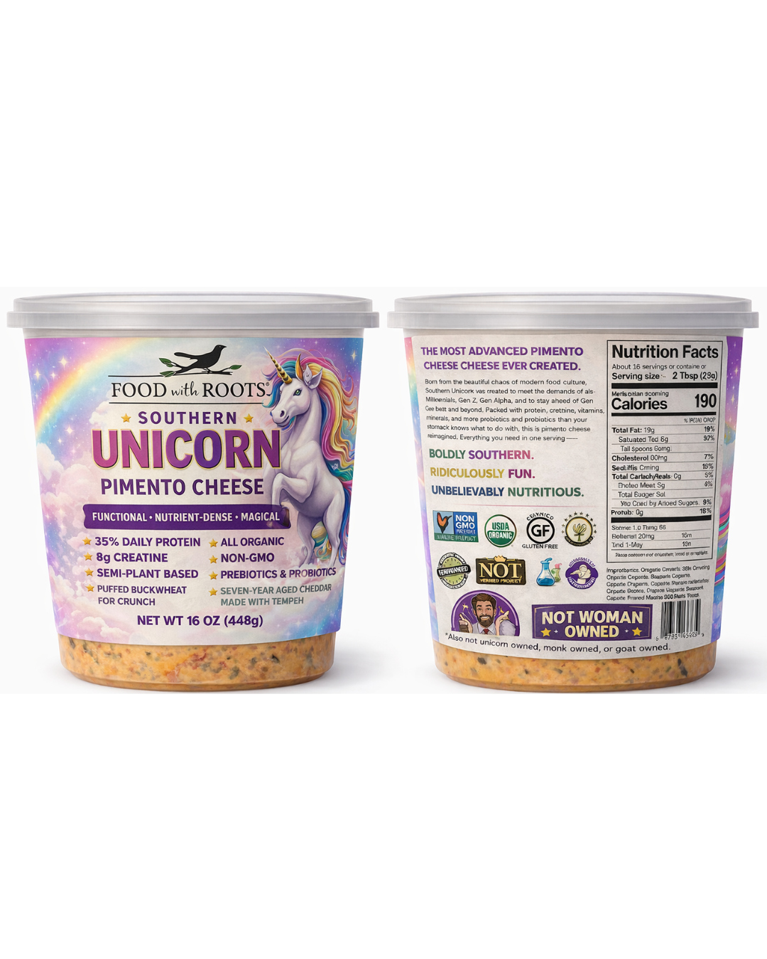 Meet the ultimate super snack you didn't know you needed. Unicorn Pimento Cheese is our most powerful pimento cheese yet — packed with adaptogens, creatine, protein and buckwheat puffs to fuel your body and satisfy your cravings.